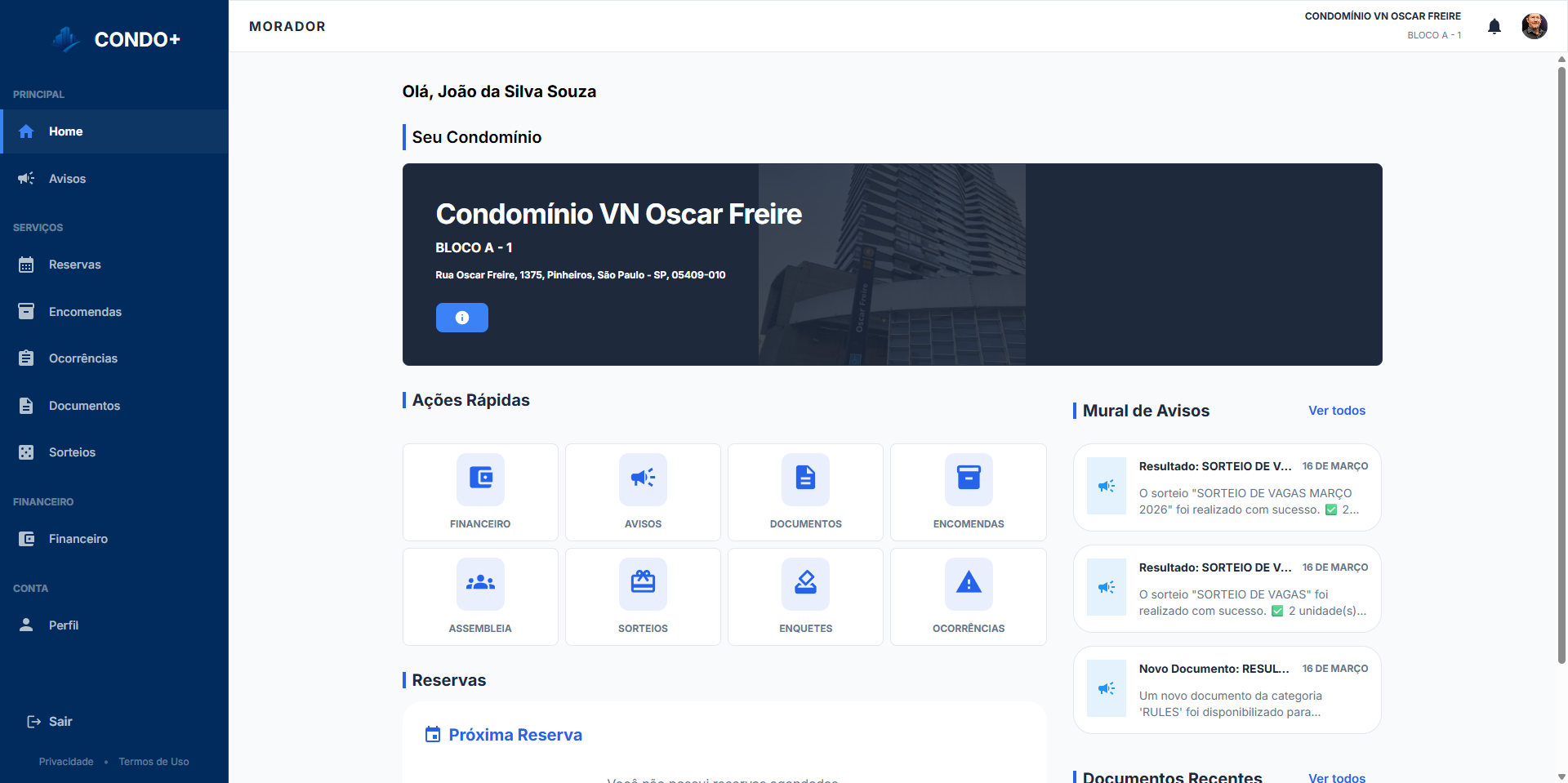 Controle financeiro, reservas de áreas comuns, gestão de portaria e comunicação com moradores em um único lugar.